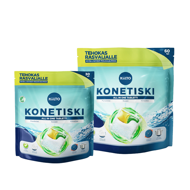 Kiilto All in 1 konetiskitabletti pesee astiat puhtaiksi ja hohtavan kirkkaiksi. Sen erinomainen rasvanpoistokyky ja tehokas nesteen ja jauheen yhdistelmä liukenevat nopeasti, poistaen sitkeimmätkin tahrat ja rasvan. Tämä takaa erinomaisen pesutuloksen joka kerta. Kiilto konetiskitabletti sisältää kaiken tarvittavan – pesuaineen, vedenpehmentäjän, lasisuojan ja huuhtelukirkasteen – varmistaen täydellisen pesutuloksen. Tehokas lopputulos jo 45 asteessa. Toimii myös lyhyissä pesuohjelmissa. Tuotteelle on myönnetty Joutsenmerkki. Miedosti hajustettu.