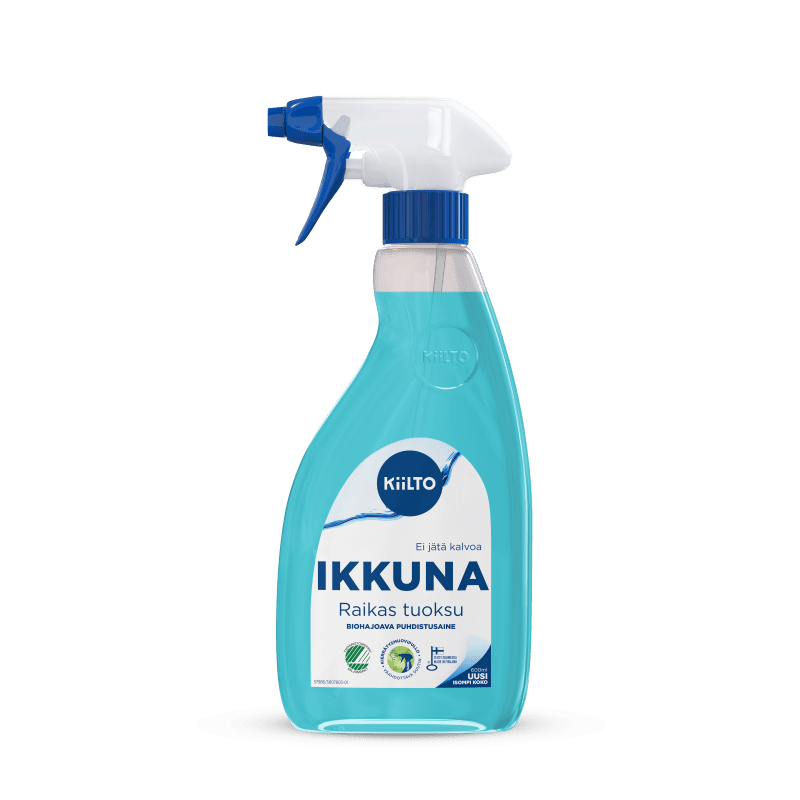 Kotimainen Kiilto Ikkuna biohajoava puhdistussuihke on tehokas ja raikas puhdistusaine, joka puhdistaa ikkuna- ja peilipinnat kirkkaan puhtaaksi, ilman raitoja. Soveltuu muun muassa ikkunoille, peileille, ovilasille ja lasipöydille. Ympäristöystävällinen, Joutsenmerkitty tuote on valmistettu Hankasalmella. Pakattu 100 % kierrätysmuovipulloon, jonka vaahdottava suutin lisää käyttöturvallisuutta vähentämällä ilmaan vapautuvia aerosoleja ja riskiä hengittää ainetta sisään. Tuotteelle myönnetty Joutsenmerkki takaa, että tuotteen ympäristövaikutukset on arvioitu, tuote on käyttäjälleen turvallinen ja tutkitusti tehokas.