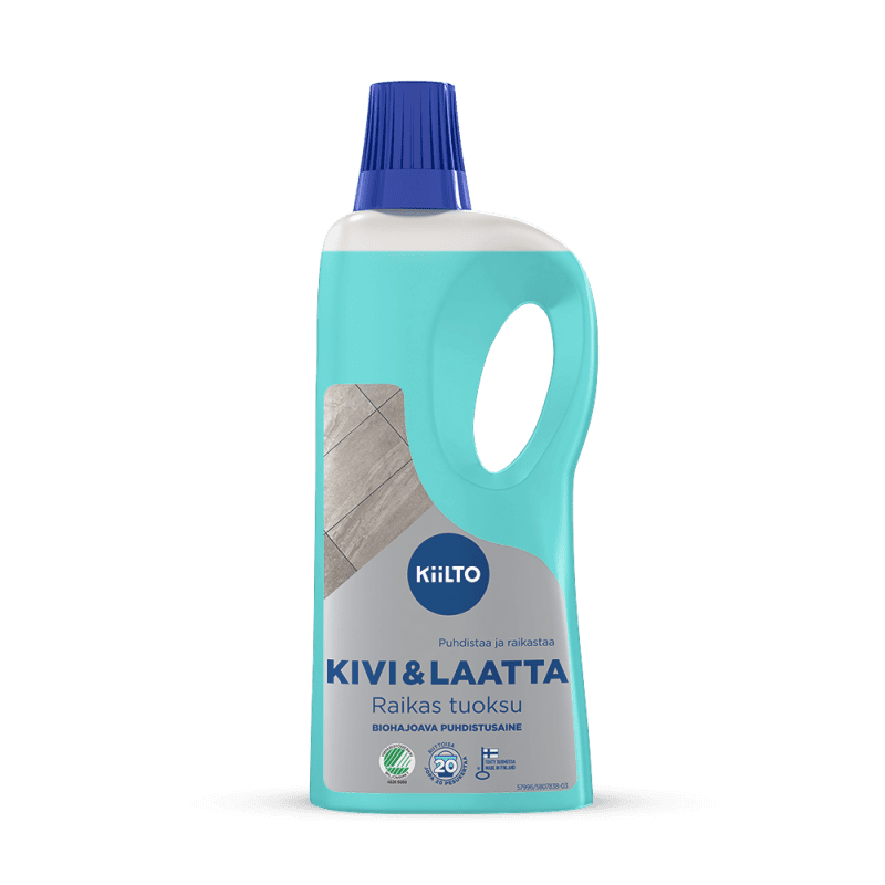 Kotimainen Kiilto Kivi ja Laatta biohajoava puhdistusaine puhdistaa tehokkaasti kivi-, kaakeli- ja muut keraamiset laattapinnat jättäen puhtaan raikkaan tuoksun. Ympäristöystävällinen, Joutsenmerkitty tuote on valmistettu Hankasalmella. Tuotteelle myönnetty Joutsenmerkki takaa, että tuotteen ympäristövaikutukset on arvioitu, tuote on käyttäjälleen turvallinen ja tutkitusti tehokas.