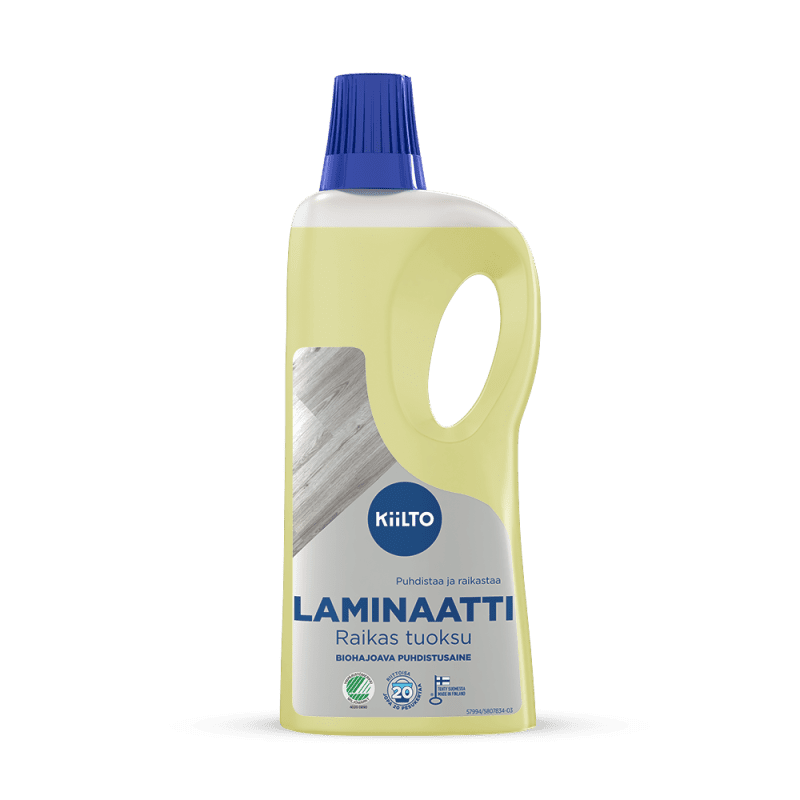 Kotimainen Kiilto Laminaatti biohajoava puhdistusaine puhdistaa tehokkaasti laminaatti-, muovi-, vinyyli- ja linoleumilattiat jättäen puhtaan raikkaan tuoksun. Kuivuu nopeasti. Ei jätä kerrostumia lattian pintaan, sillä tuote ei sisällä saippuaa. Ympäristöystävällinen, Joutsenmerkitty tuote on valmistettu Hankasalmella. Tuotteelle myönnetty Joutsenmerkki takaa, että tuotteen ympäristövaikutukset on arvioitu, tuote on käyttäjälleen turvallinen ja tutkitusti tehokas.