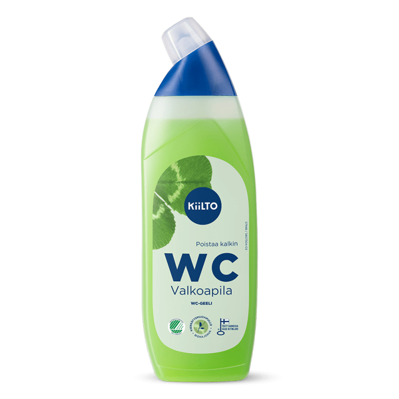 Kotimainen Kiilto WC-geeli Valkoapila puhdistaa WC-istuimen altaan tehokkaasti ja ympäristöystävällisesti jättäen raikkaan tuoksun. Helposti biohajoava maitohappo poistaa tehokkaasti kalkkisaostumia. Ympäristöystävällinen, Joutsenmerkitty tuote on valmistettu Hankasalmella ja pakattu 100 % kierrätysmuovipulloon. Tuotteelle myönnetty Joutsenmerkki takaa, että tuotteen ympäristövaikutukset on arvioitu, tuote on käyttäjälleen turvallinen ja tutkitusti tehokas.